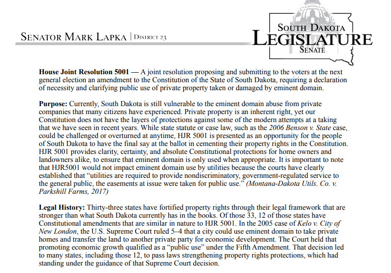 Action: With the passage of HJR 5001E, South Dakotans would have the constitutional and statutory framework to provide substantial protections against private use of eminent domain, particularly by excluding eminent domain for economic development purposes. Having consulted with colleagues in the legislature, as well as many Constitutional experts and legal counsel, we propose moving forward with the submitted amended version.